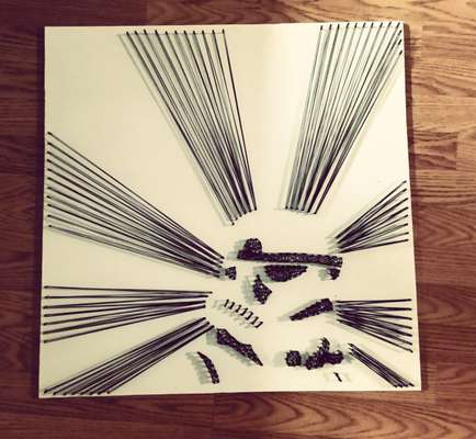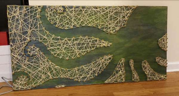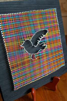 A forma mais simples de montar um quadro assim é imprimindo um desenho simples (quanto menos detalhes, mais fácil é de fazer) e colocando-o por cima de uma tábua de madeira. Então, você marca o contorno da figura com preguinhos, remove o desenho e dá um nó com a linha colorida em um dos pregos. Daí, é só enroscá-la por cada um deles. Basta imaginar que o fio funciona como um lápis de cor: são esses “riscos” que criam o desenho. Veja só: