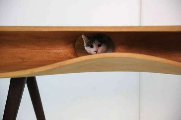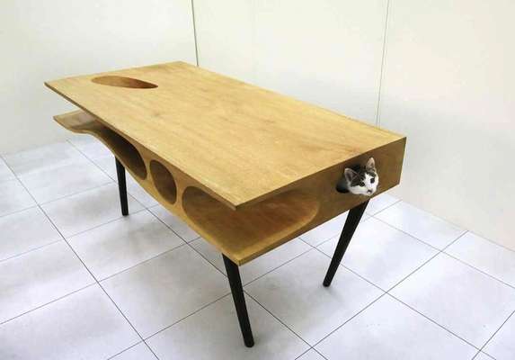 Criada por Ruan Hao para o escritório de arquitetura LYCS, a CATable é uma mesa de madeira funcional projetada para pessoas e gatos. Com buracos e passagens longas, a mesa incentiva os felinos a andarem livremente embaixo de onde os humanos trabalham ou estudam.