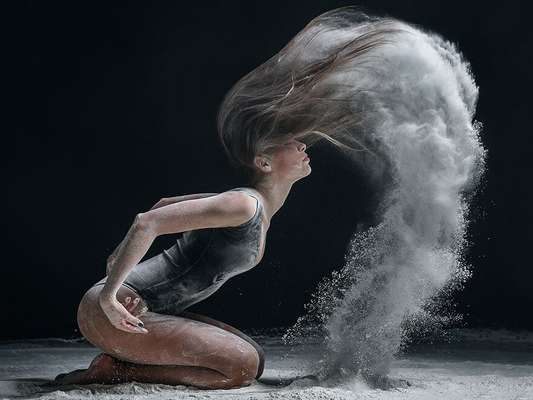Para alguns cliques, Yakovlev adiciona elementos explosivos, como um pó branco que contorna a silhueta do dançarino como mágica e gera um efeito impressionante.
