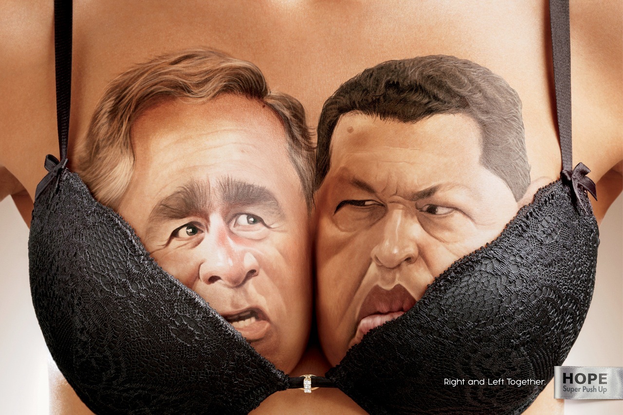 Somente a marca de sutiãs Hope para unir a esquerda e a direita. Ou você acha que George W. Bush e Hugo Chávez, Ronald Reagan e Fidel Castro, Margaret Thatcher e Ernesto Che Guevara ficariam assim tão próximos? Confira as fotos da campanha “Left and right together” (Esquerda e direita juntos, tradução livre).
