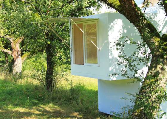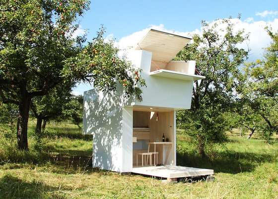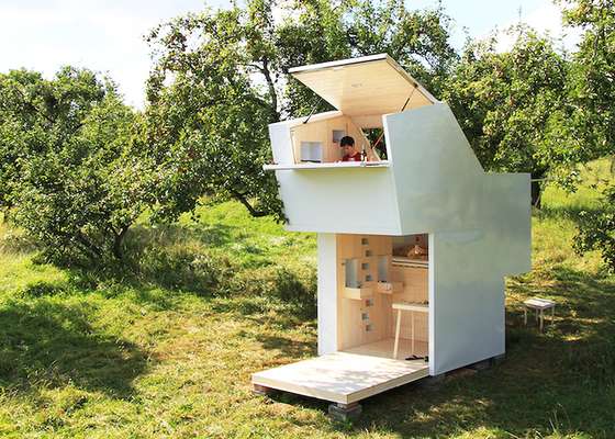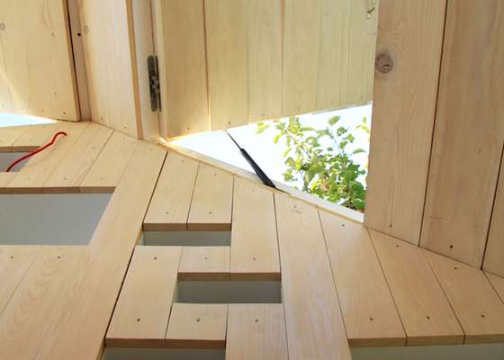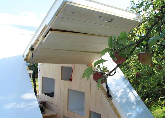A estrutura de madeira pode ser desmontada e facilmente transportada. Ela possui dois andares, cozinha no piso inferior e um quarto e plataforma de observação no superior. O teto se abre e permite a entrada da luz e apreciação da vista.