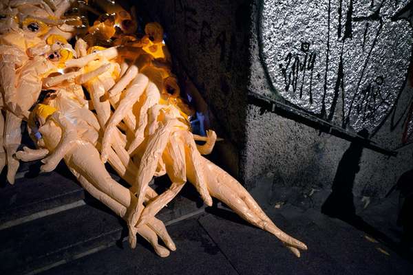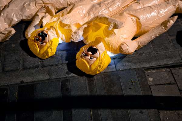 O coletivo também têm, outras intervenções interessantes, como um labirinto de resíduos plásticos na Polônia e um pisoteamento de direitos sociais na Espanha – um protesto contra uma lei que proibia a interrupção voluntária da gravidez no país.