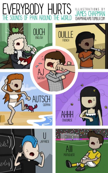 O artista inglês James Chapman já havia feito um estudo de como sons de animais são representados ao redor do mundo, mas agora ele foi mais longe. Ele criou diversas ilustrações com as onomatopeias e expressões comuns representadas em diversas línguas.