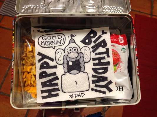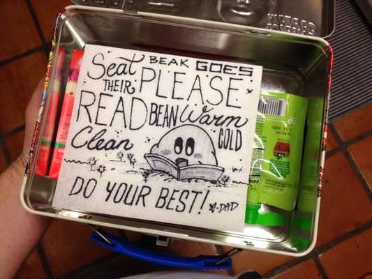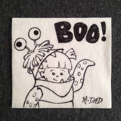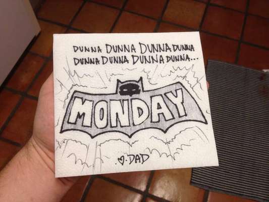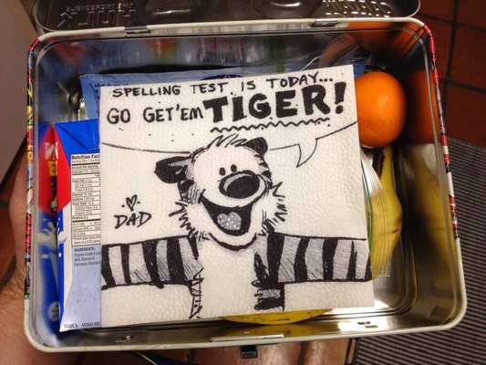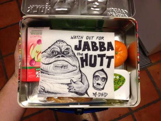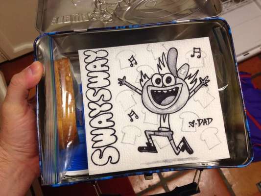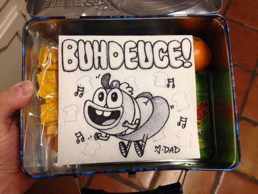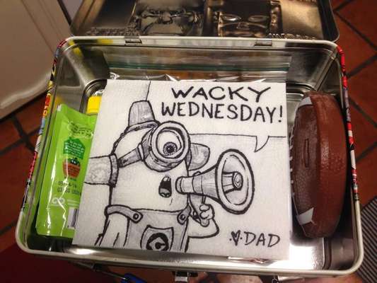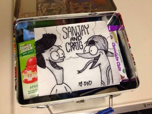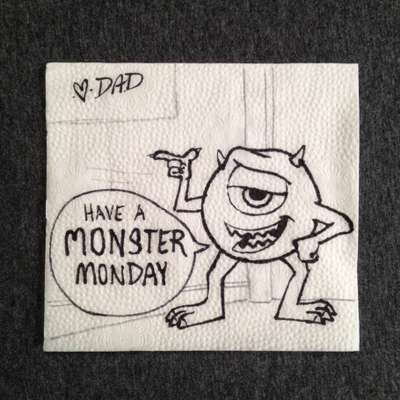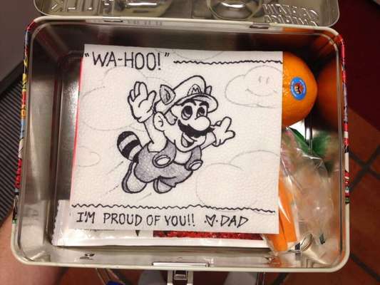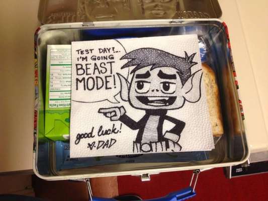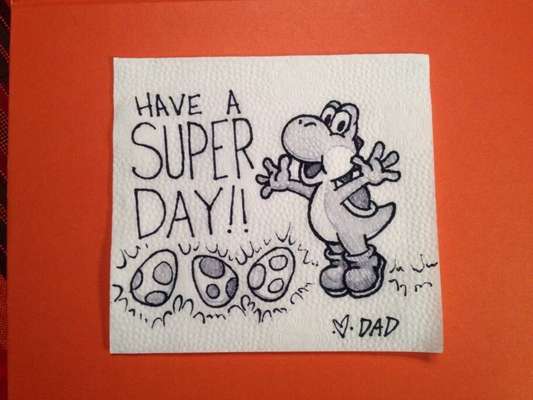 Para enviar mensagens positivas para o filho Jacob, Jonathan Palmisano, da Lousiana, EUA, desenha personagem e recados positivos em um guardanapo e guarda na lancheira do filho.