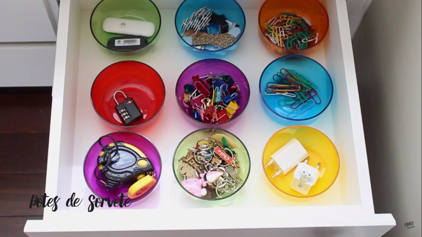 Isopor, papel contact, potes de sorvete, ganchos adesivos e caixa de sapatos. Tudo isso pode te ajudar a organizar objetos em gavetas, criar divisórias e guardar miudezas. Apostando nesses itens, a designer de interiores e personal organizer Rafaela Oliveira, do canal “Organize sem Frescuras”, criou 10 soluções super baratas charmosas para colocar a casa em ordem.