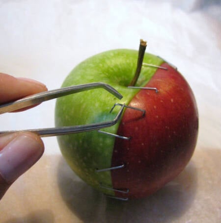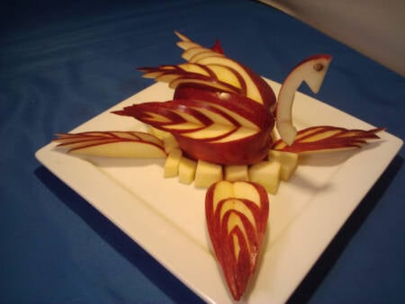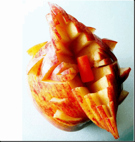 Tem um pouco de tudo nessa série, desde incríveis trabalhos que parecem pinturas apenas cortando a casca da maçã como o apresentado acima, deliciosas maçãs do amor em seus diversos formatos, pequenas esculturas feitas com pedaços de maçã e algumas feitas com outras frutas, uma pequena série para agradar as crianças e uma série que eu chamaria de maçã Frankenstein onde eles misturam maçãs verdes e vermelhas para compor belos trabalhos.