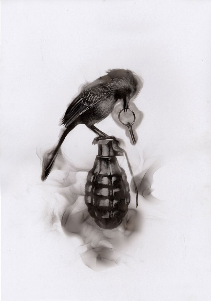 Sua mais recente série ‘Ornithocide’ apresenta aves vivas e mortas justapostas com vários instrumentos feitos pelo homem com o intuito de matar, tais como granadas e dispositivos utilizados para pulverizar pesticidas nas culturas.