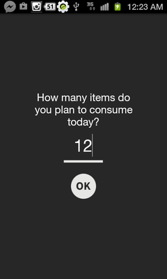 Utilizando uma interface simples e objetiva, o usuário indica ao aplicativo seus padrões de consumo por meio da interação com um botão que acrescenta uma entrada no logger quando o objeto que pretende controlar for consumido (uma xícara de café, um cigarro, a visualização de uma rede social).