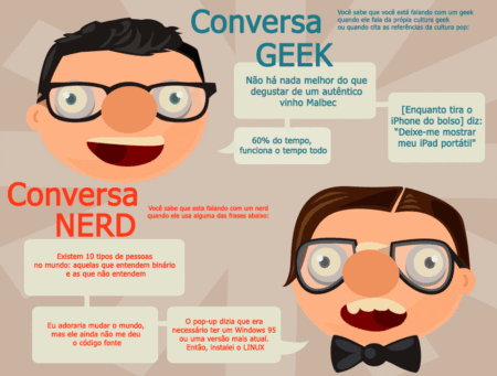 Termos recorrentes nas tribos urbanas os Geeks e os Nerds dominam hoje grande parte do público de cinema, livros e séries de televisão. Mas você qual a diferença entre esses dois nomes? Um infográfico divulgado pelo Portal Caneca esclareceu as principais diferenças e semelhanças entre os dois grupos. E você? Onde fica nessa história?