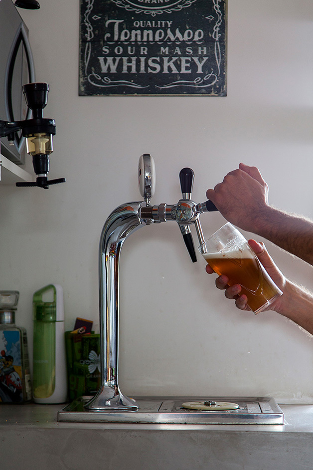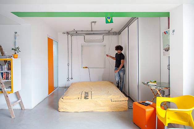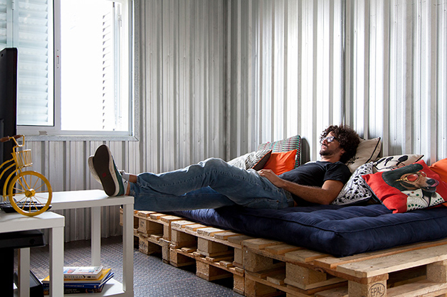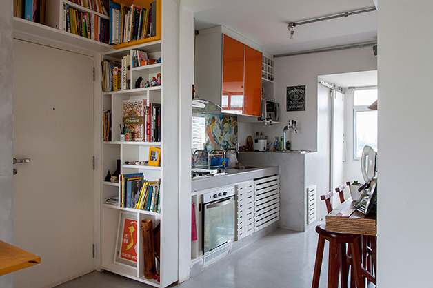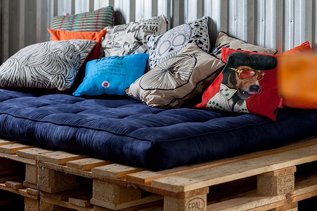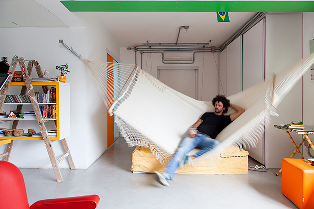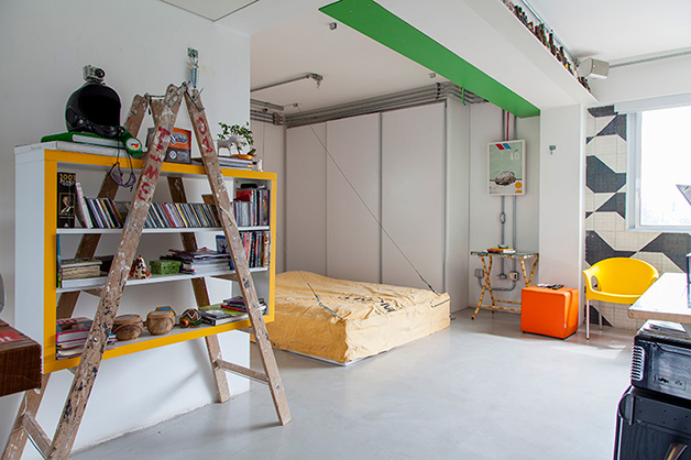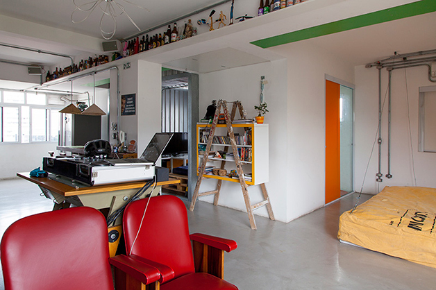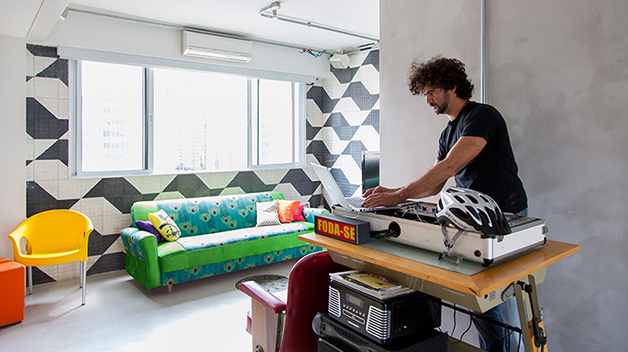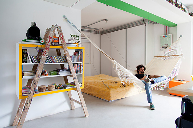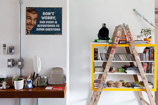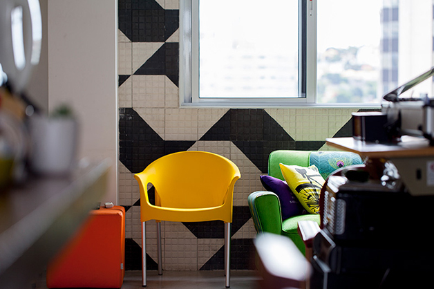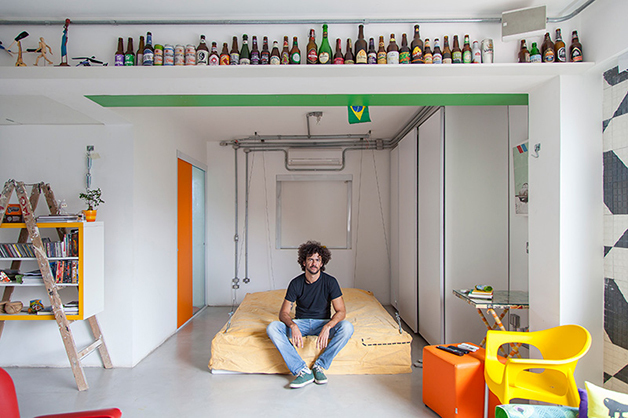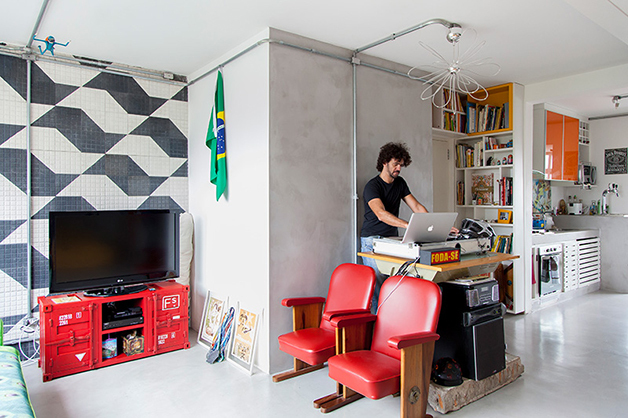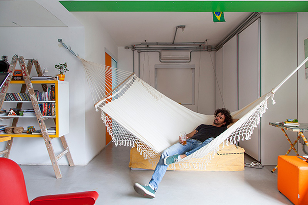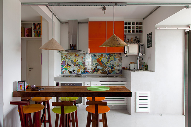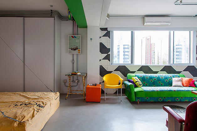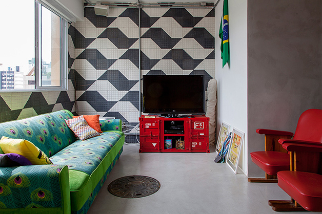 Localizado no bairro do Brooklin (São Paulo), o espaço de 78 m², batizado de “apêbalada” graças as diversas festas que já aconteceram na residência, é ao mesmo temo aconchegante e moderno, e traz em sua decoração objetos inusitados como uma estilosa prateleira feita com uma escada velha, uma tampa de bueiro, uma cama feita com paletes, uma rede e, a cereja do bolo, uma torneira de chopp para servir os mais chegados.