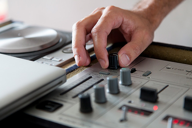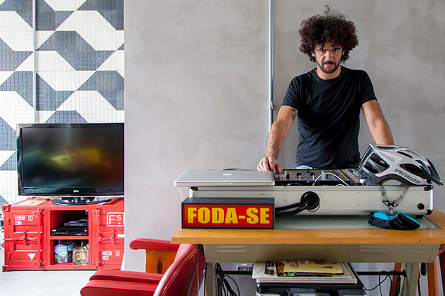 Apaixonado por música, Piu ainda colocou uma mesa de som ao centro da sala do cantinho criativo que reside há 4 anos.
