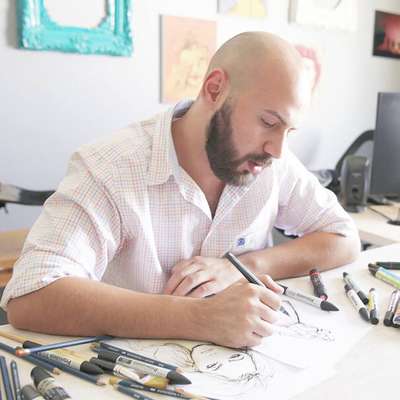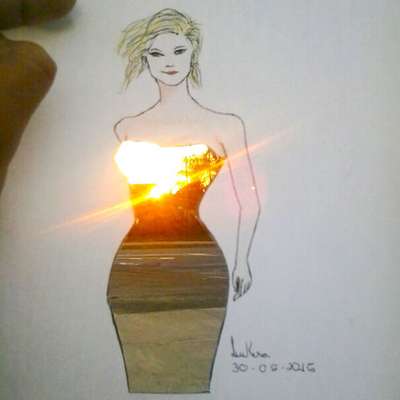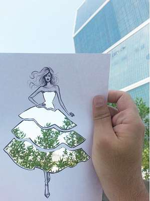 O ilustrador e arquiteto Shamech Bluwi utiliza um pedaço de papel com uma mulher com vestido para compor paisagens. A base da ilustração é recortada, com o objetivo de que a realidade se misture com os desenhos.