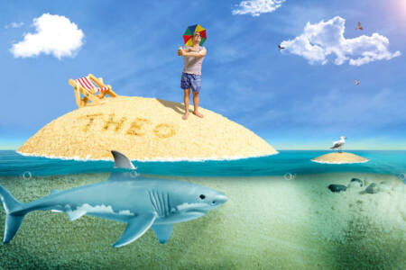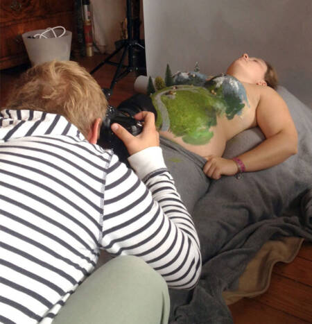 A forma curvilínea ajudou a imitar uma variedade de paisagens, e seu estômago estava coberto de materiais não tóxicos e de pele tolerante, que o transformou em colinas e dunas de areia. Árvores em miniatura, rochas e um pequeno boneco de neve promoveu a ilusão. Depois de configurar as cenas, Schaffrath os fotografou e retocou as imagens no Photoshop.