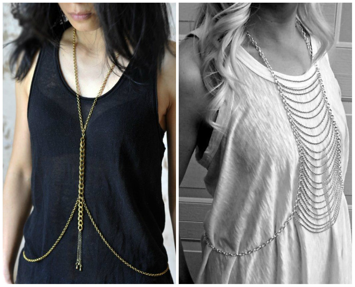 Os colares para o corpo voltaram com um toque de glamour e imponência. O queridinho das celebridades pode ser usado por cima de uma t-shirt básica ou vestidos mais justos. Como ele é uma peça grande e o ponto principal da produção, não exagere com outros acessórios.