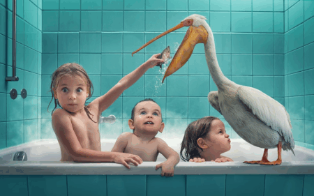 “Se você precisa das crianças em uma certa pose fica um pouco difícil. Eu geralmente tento inspirá-las contando uma história interessante sobre algum próximo projeto. Nós simulamos a situação sem a câmera. Depois de entrarmos no meu estúdio/sótão, não tenho mais nem dois ou três minutos até elas começarem a perder a atenção e a motivação. As vezes doces ajudam.”