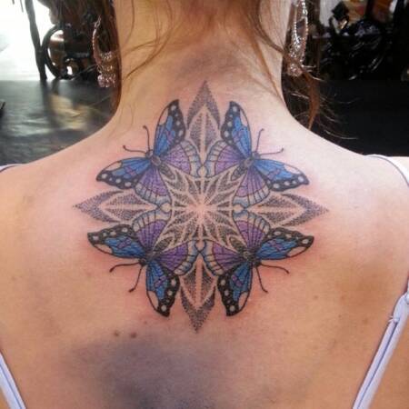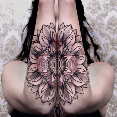 Tatuagens de mandala são simétricas, geralmente inspiradas por um símbolo ritual no hinduísmo e no budismo. O padrão geométrico circular remete ao equilíbrio, harmonia e infinito cósmico.