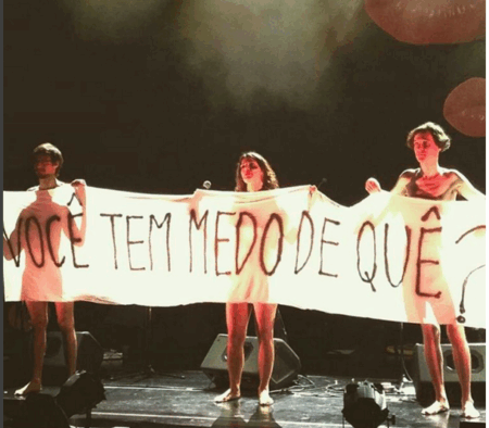Convidados do show, os músicos Tatá Aeroplano e Peri Pane acompanharam a cantora no ato. Os três ergueram um cartaz com a frase: “Você tem medo de quê?”