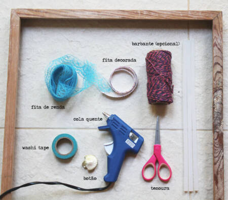 A moldura repaginada do Colacorelinha leva washitape, renda, botão (claro!) e fita de cetim decorada. Nada mais que isso. E para combinar com o nome do blog, a cola não pode faltar. E é ela quem resolve de forma pá-pum o projeto.