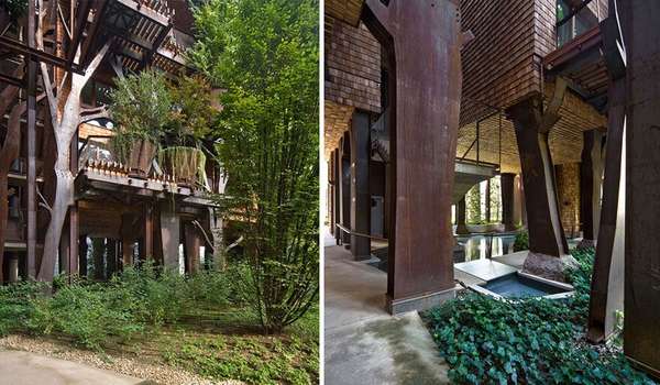 A ideia do arquiteto foi tirar as plantas do chão e colocá-las suspensas por todo o prédio. A grande variedade de árvores absorvem 200 mil litros de dióxido de carbono a cada hora.