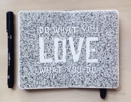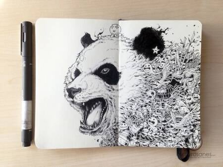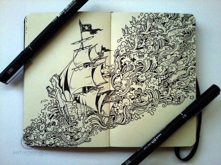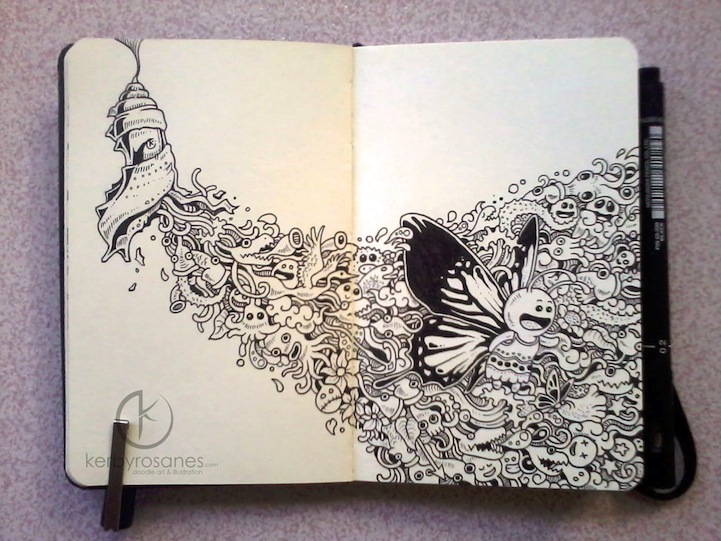 Usando somente um simples Moleskine e uma caneta hidrográfica preta – além de uma talento nato para o desenho – Rosanes preenche a páginas do caderno com traços complexos e cheios de detalhes. É possível passar um bom tempo olhando para cada um dos desenhos, descobrindo cada detalhe.