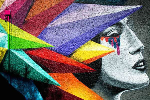Surrealismo, pop art, formas geométricas e orgânicas podem ser observadas nos trabalhos do grafiteiro