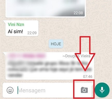 Abra uma conversa para enviar a imagem que deseja. Toque no símbolo da câmera, ao final da caixa de entrada de texto, como indicado na imagem.