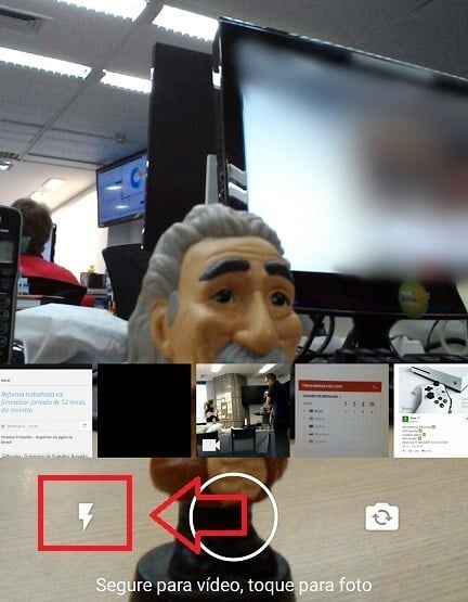 Com a câmera aberta, você tem várias opções. Primeiro, como selfie, é possível ativar o flash simplesmente clicando no símbolo de “raio”. Veja abaixo.