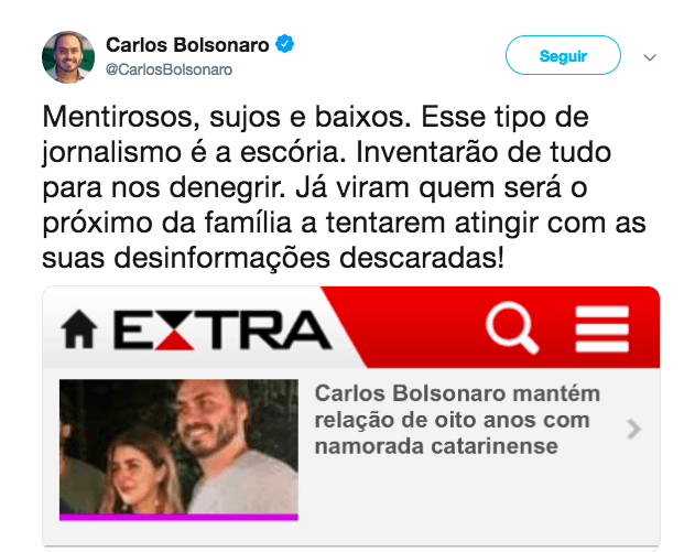 Para ficar mais claro o recado, basta ver essa post de Carlos Bolsonaro, porta-voz da familia nas redes sociais: “A mentira tem perna curta, fundo azul, letras em branco e está desesperada pelo dinheiro da população que a abastecia!”