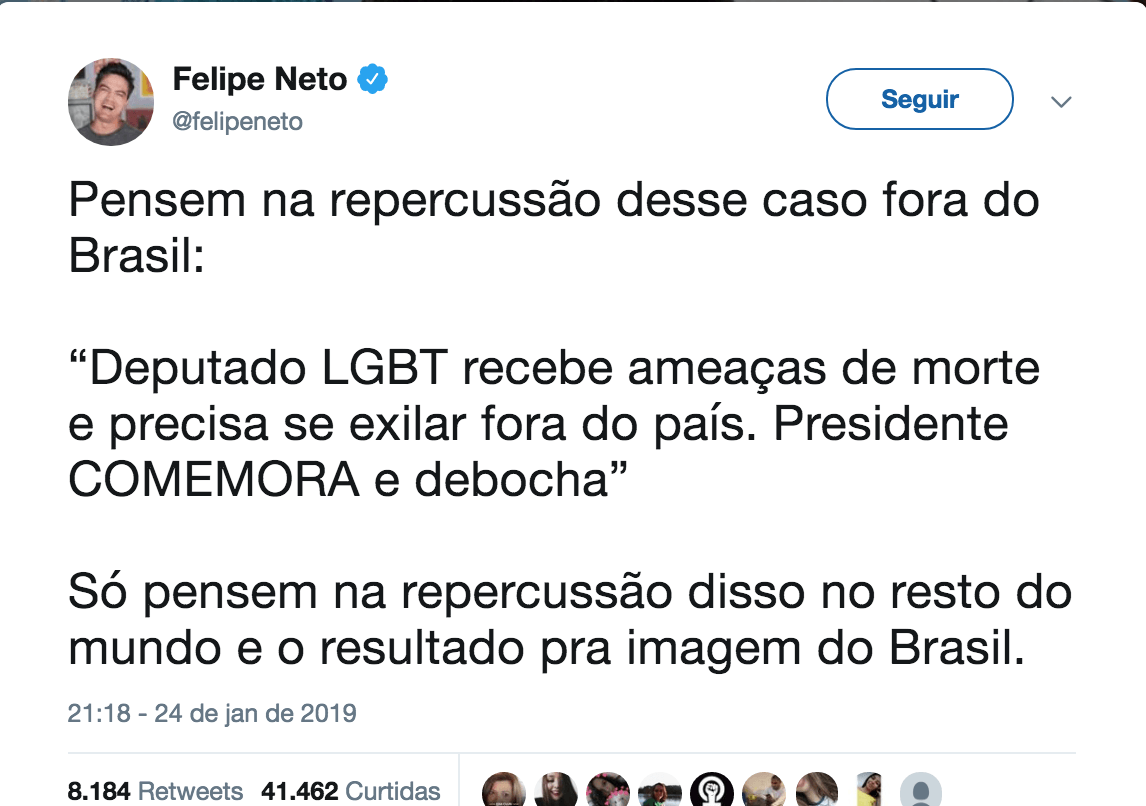 A pauta de Felipe Neto é de defesa da diversidade em defesa de gays, feminismo, desarmamento.