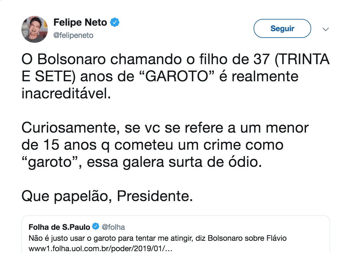 Esse post acima é apenas um detalhe de como Felipe Neto, com seus 30 milhões de seguidores do Youtube, lidera a ofensiva nas redes sociais contra Jair Bolsonaro.