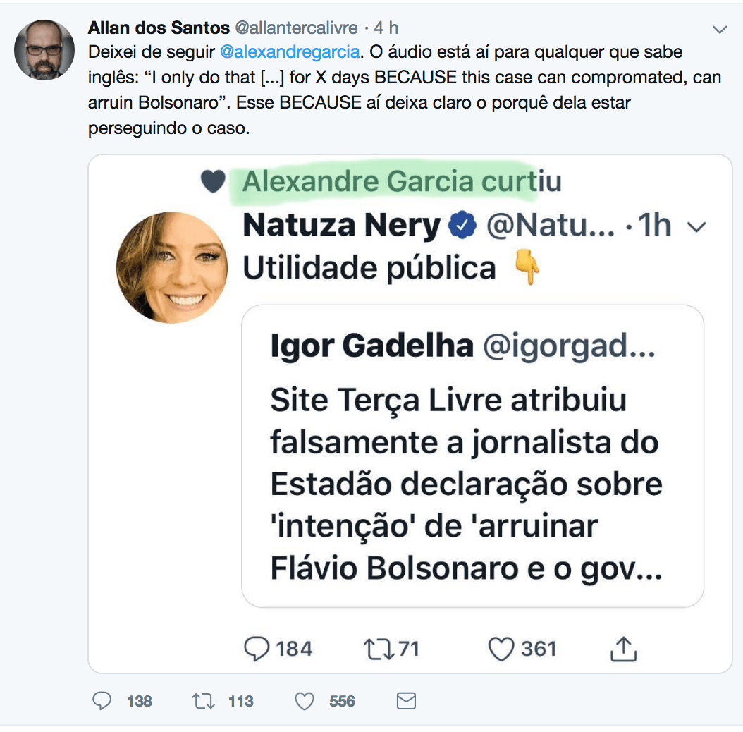 Motivo: ele deu um like num post de Natuza Nery que mostrava a mentira publicada por Allan dos Santos sobre a suposta motivação do Estadão no furo sobre as contas de Flávio Bolsonaro.