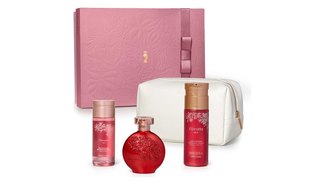 Quem não amaria um kit poderoso? O do Floratta Red com uma colônia de 75ml, um hidratante de 200ml, um óleo corporal de 200ml e 1 nécessaire está com desconto de 20%, saindo por R$289,90.