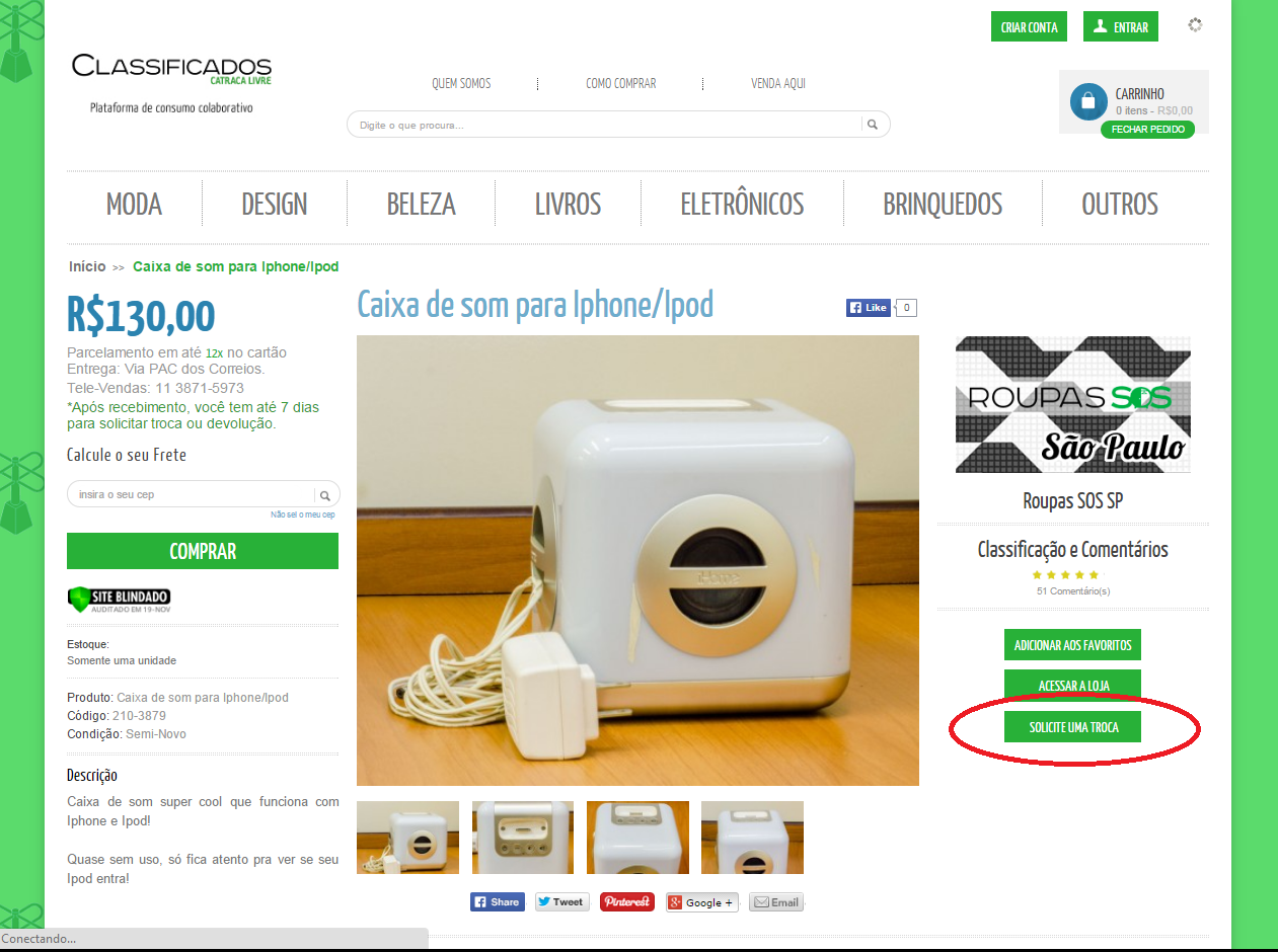 Para isso, basta escolher um objeto anunciado e clicar no botão “Solicite uma troca” (veja imagem destacada abaixo). Você será guiado para um campo no qual deve preencher com nome e e-mail para entrar em contato direto com o dono da peça.