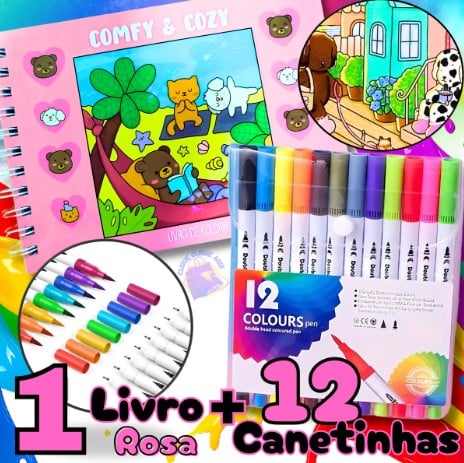 Livro De Colorir Comfy E Cozy Capa Dura 50 Folhas Com Acetato + Kit Com 12 Canetinhas Brush Pen Ponta Dupla Coloridas