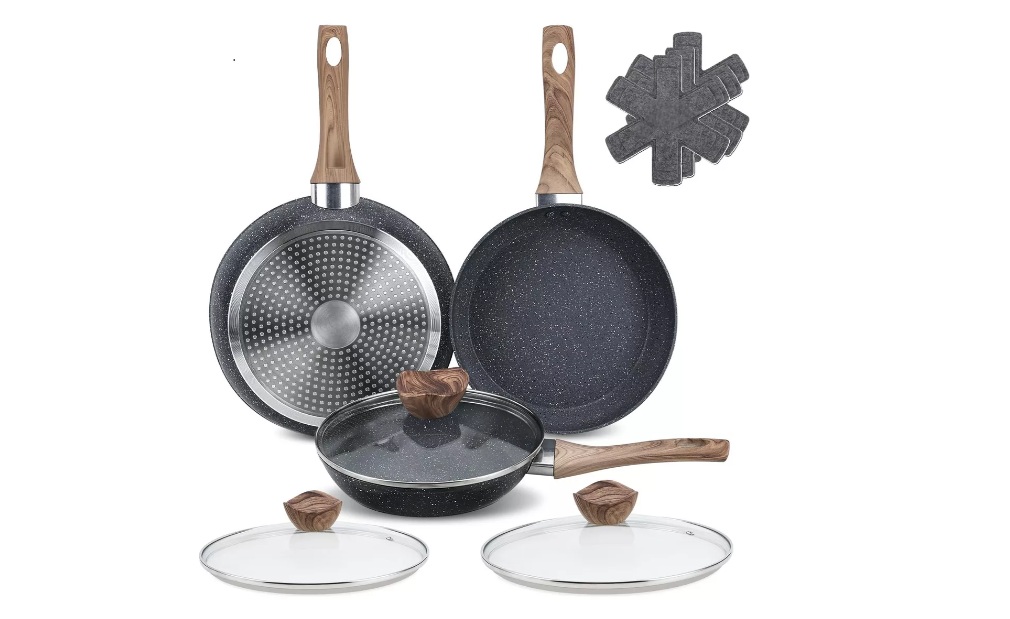 As panelas têm um revestimento antiaderente de granito, permitindo que a comida não grude com tanta facilidade. Elas medem 20cm, 24cm e 26cm de diâmetro e são compatíveis com fogões a gás, elétricos, de indução e vitrocerâmicos.