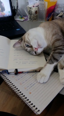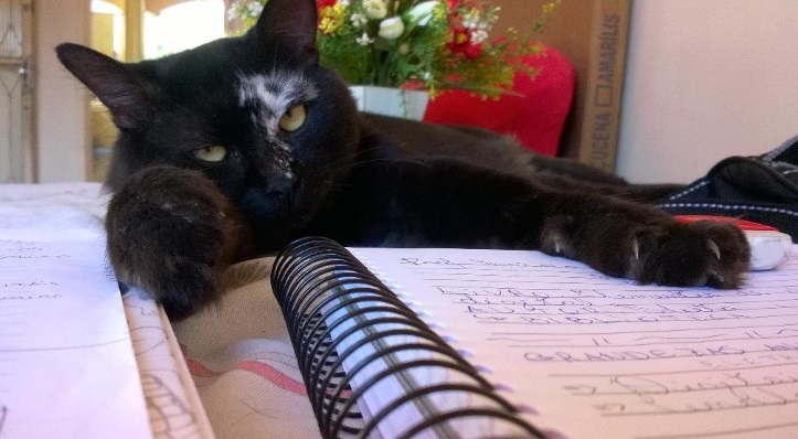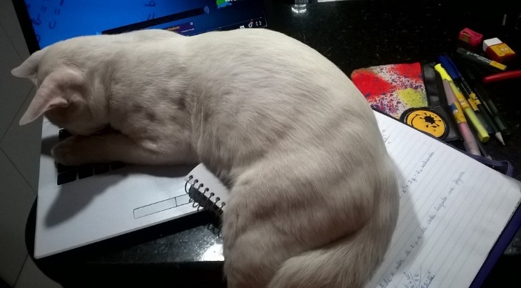 2. Um caderno é um bom lugar para uma soneca 3. “Humano, por favor, me deixe deitar aqui” 4. Desmaiada. 5. É tanta fofura que não tem como ficar bravo. 6. “Sou charmoso e lindo, me ame e pare de ler isto” 7. Juro que tentei estudar. 8. Mas não deu. 9. “Vem cá me dar carinho, agora” 10. Um é bom, dois é mais fofura ainda.