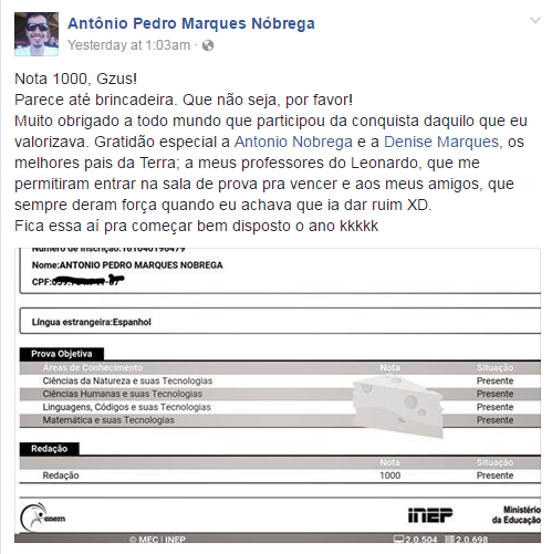 Tem nota mil no Distrito Federal também. Antônio Pedro Marques Nóbrega, de 18 anos, disse que “parece brincadeira” e não escondeu a felicidade nas redes sociais. “Muito obrigado a todo mundo que participou da conquista daquilo que eu valorizava”, postou no Facebook em comemoração.