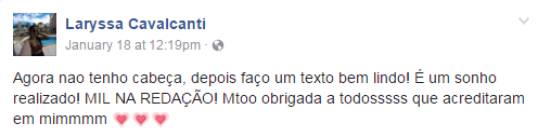 Do Piauí vamos para Alagoas, onde mora a estudante Laryssa Cavalcanti, de 17 anos. Ela também conseguiu nota máxima no Enem 2016. De acordo com reportagem do G1 local, ela fez 82 textos para treinar a escrita. Pelo Facebook, ela comemora o resultado.