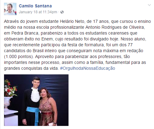 Com 17 anos e excelente resultado, ele se surpreendeu com a nota. “Superou total minhas expectativas. Não esperava um resultado significativo assim. Foi só alegria”, disse ele ao G1 CE. Até Camilo Santana, governador do estado, compartilhou o feito do rapaz em sua página oficinal no Facebook.