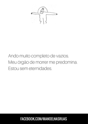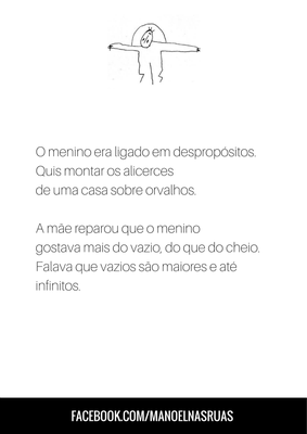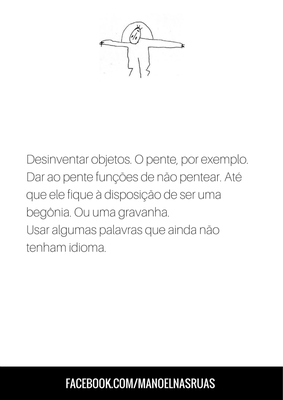 Desde então, Gravatá anda com poesias de Manoel na mochila, prontas para serem coladas nas ruas de São Paulo. Às vezes, sua abordagem vai além. “Posso dizer para uma pessoa que quero lhe dar um presente e entregar a poesia em mãos”, conta ele. “Também posso interromper alguém que passa e perguntar se posso ler uma poesia para ele.”
