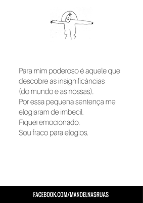 Além de aumentar o contato com a obra do artista e, consequentemente, o apreço por ela, a intervenção busca propiciar momentos de leveza no ambiente urbano. “Muitas vezes, as pessoas estão mau humoradas, veem uma poesia e isso leva mais cor para o dia dela”, diz Ana Carla. Segundo André, o contato com a arte de Manoel pode ser um “esticador de horizontes”, para usar uma expressão do poeta preferidas pelo arte-educador. Com a ajuda de colaboradores, o projeto Manoel nas Ruas já chegou ao Rio de Janeiro, Porto Alegre, Brasília e Campo Grande. E a dupla garante que os versos seguirão esticando horizontes em 2015, transbordando palavras bonitas para além das bibliotecas e das escolas até conquistar as ruas.