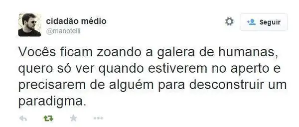 O que não falta na internet é zoeira. E a galera que escolheu as carreiras de humanas na universidade não saiu ilesa desse furacão de memes. Se você é do time dos que curtem miçangas e vendem arte na praia (brincadeira, estamos entre amigos), aproveite para se divertir um pouco. Caso não seja, que tal mandar esse post para aquele seu amigo da Filosofia? Confira a galeria e boas risadas: