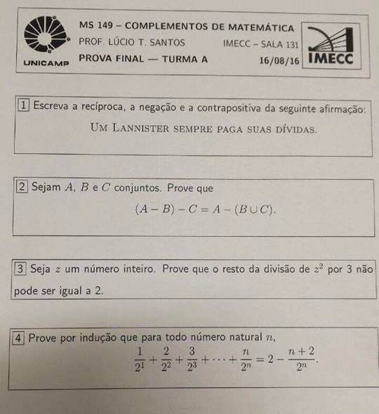 A citação surpreendeu os estudantes da turma na disciplina “Complementos da Matemática”. Logo depois que a prova acabou, fotos da perguntam viralizaram pelas redes sociais. “Um Lannister sempre paga suas dívidas”, foi a frase usada na questão. Confira: