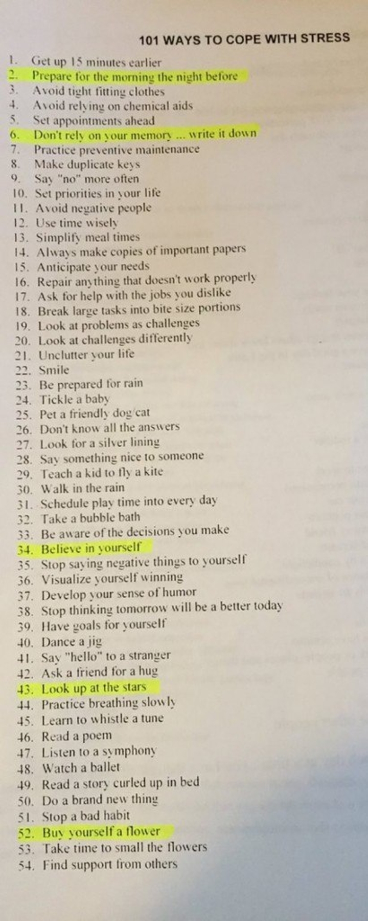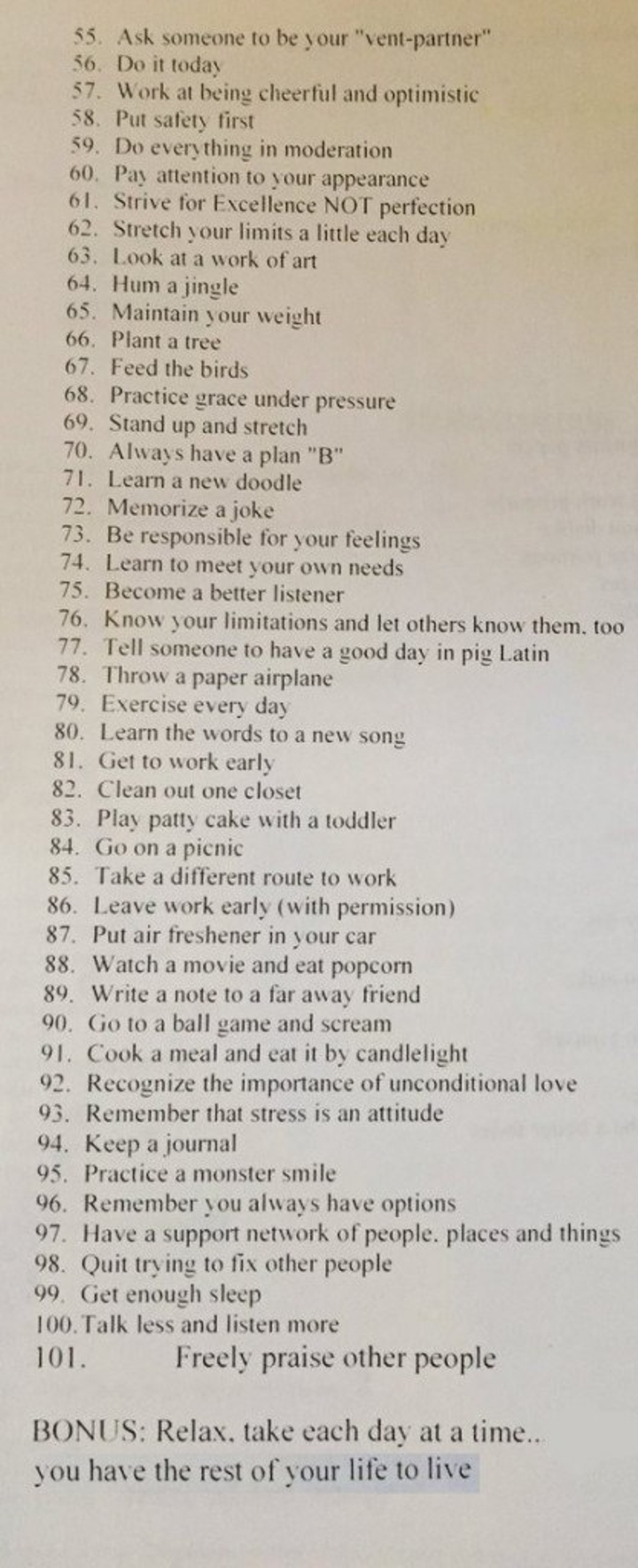 Ela entregou para eles uma lista com 101 sugestões de como lidar com estresse. As folhas de papel foram publicadas no Twitter pela estudante @lovelyyy_lina. “Minha professora de psicologia nos deu este papel sobre como lidar com o estresse e pensei em compartilhar isso”, disse.
