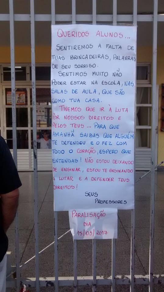 “Sentimos muito não poder estar na escola, nas salas de aula, que são como tua casa. Tivemos que ir à luta por nossos direitos e pelos teus… Para que amanhã saibas que alguém te defendeu e o fez com todo o coração, espero que entendas! Não estou deixando de ensinar, estou te ensinando a lutar e a defender teus direitos!”, diz um trecho do cartaz.