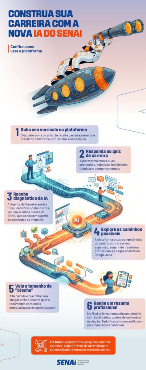 O simulador faz parte do ecossistema de inteligência artificial do SENAI, que inclui o serviço Carreira e Empregabilidade. A partir de informações como currículo, histórico profissional e descrição de experiências, o sistema mapeia competências, identifica lacunas de qualificação e sugere caminhos de desenvolvimento alinhados às demandas da indústria.