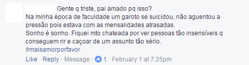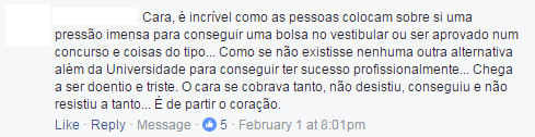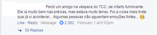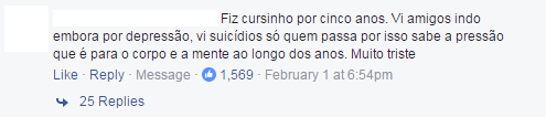O post recebeu mais de 50 mil reações no Facebook e rendeu uma importante discussão relacionada à saúde de vestibulandos e estudantes de ensino superior – que passam noites sem dormir por conta dos estudos, enfrentam pressões da vida acadêmica, fora a dificuldade de socialização e má alimentação, por exemplo.