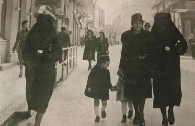 Uma mulher muçulmana cobre a estrela amarela de sua amiga judia com um véu para protegê-la da acusação. Sarajevo, ex-Jugoslávia. [1941]