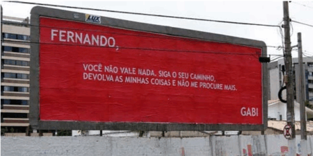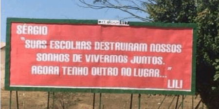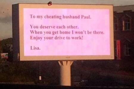 Na manhã desta quarta-feira, 23, uma britânica, identificada como Lisa, usou um outdoor eletrônico na estrada de Sheffield, na Inglaterra, para se despedir do marido Paul, acusado por ela de traição. “Para o meu marido infiel Paul. Vocês se merecem. Quando voltar para casa, não estarei lá. Aproveite sua ida ao trabalho! Lisa”, escreveu a mulher.