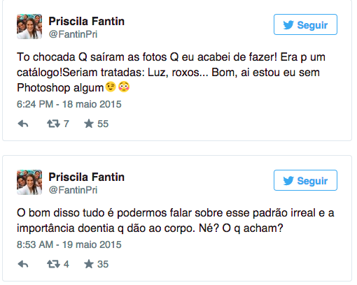 Ela se disse incomodada não apenas com o vazamento. Mas com o fato de que as fotos não tiveram tratamento. “Estou chocada que saíram as fotos que eu acabei de fazer! Era para um catálogo! Seriam tratadas: luz, roxos… Bom, aí estou eu sem Photoshop algum, começou na segunda-feira, dia 18. O bom disso tudo é que podemos falar sobre esse padrão irreal e a importância doentia que dão ao corpo. Né? O que acham?”